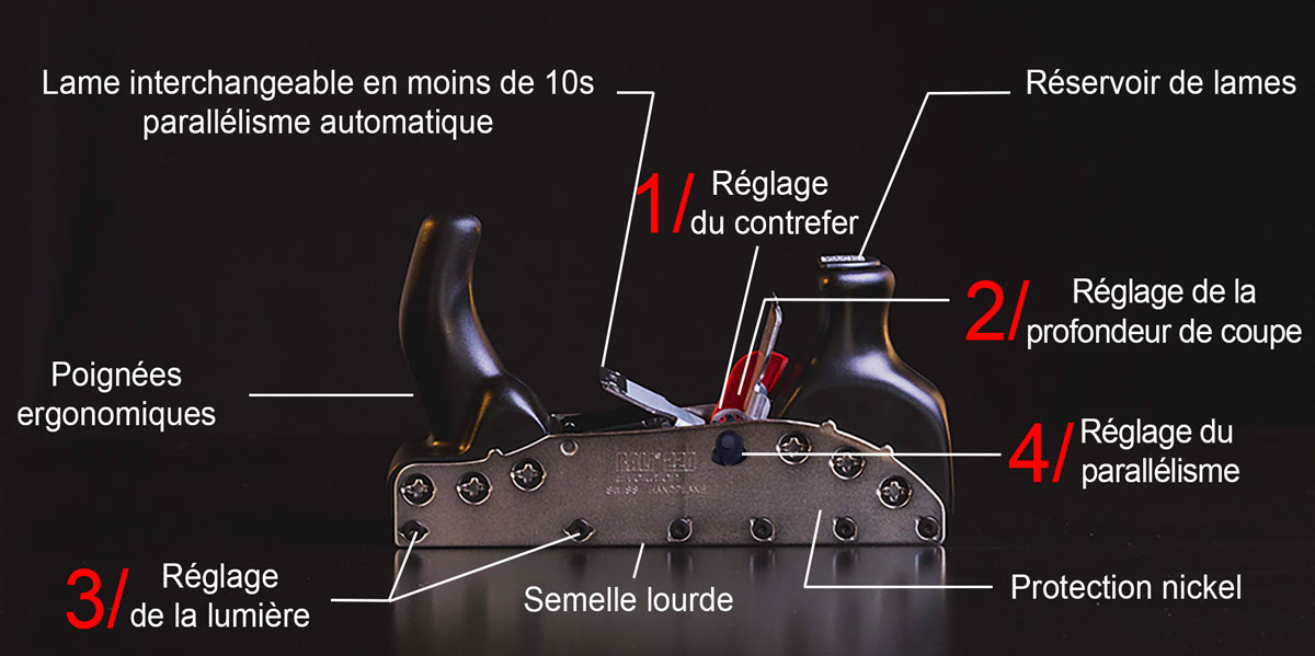 Le nouveau rabot à planer haut de gamme inclut désormais un 4ième réglage pour ajuster le parallélisme de la lame.
